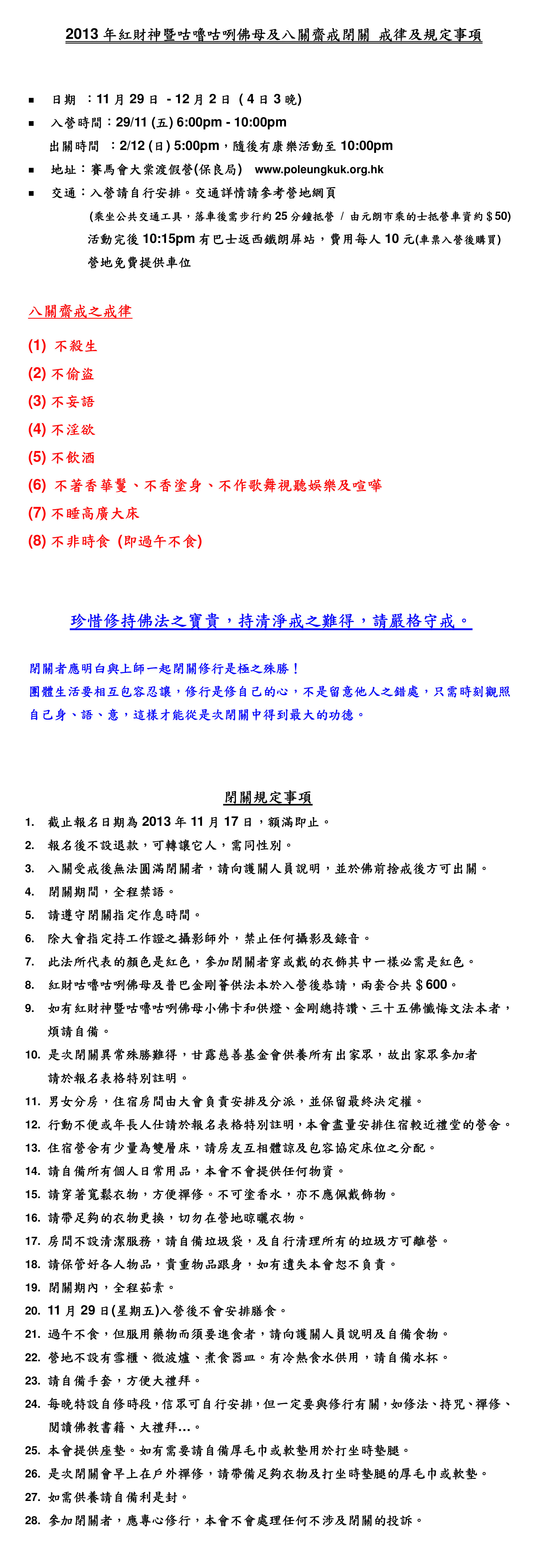 - 恭請閉關用的法本和其它各事項,請參考《閉關規定事項》,具體請瀏覽本會網頁。